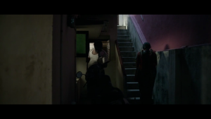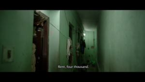 அடுத்தநாள் இளங்கோவும் அவனுடைய நண்பனும் அட்வான்ஸ் கொடுப்பதற்காக அவரை சந்திக்கும்போது அந்த சந்தர்ப்பவாத வீட்டுக்காரர் ஐடி யில் வேலை பார்க்கும் ஒருவரிடம் ஏற்கனவே அட்வான்ஸ் வாங்கிவிட்டதாகச் சொல்கிறார். அதாவது அதிகமான நிலையான வருமானம் உள்ள வேறொருவரிடம். இந்தக் காட்சியில் வீடு விசாலமாக இருந்தாலும் அதன் வெளியானது குருகி விரோதமும் பகையும் நிறைந்ததாக உள்ளது. நல்ல பிரகாசமான வீட்டு சூழல் இருந்தபோதும் இளங்கோவை வெறுக்கும் அந்த மேல்சாதி வீட்டுக்காரின் கெட்ட நோக்கத்தால் ஆரம்பத்திலிருந்தே அந்த வீடு இருண்மையின் குறியீடாக இடம் பெறுகிறது. பெரிய வசதியான முன்அறை இருந்தாலும் அங்கேதான் இளங்கோ தன்னுடைய சமூக பொருளாதார இயலாமைகளால் தான் அவமானப்படுத்தப்பட்டதாக உணர்கிறான். இளங்கோவின் அழுத்தப்பட்ட மன உணர்வுகள் படத்தில் பல இடங்களில் கோபமாக வெளிப்படுகின்றன. அவனது கொந்தளிப்பு செழியனின் கைவண்னத்தில் காண்பியல் மொழிப்படிமமாக உருக்கொள்கிறது. எடுத்துக்காட்டாக, அவன் வீட்டில் அமுதாவுடன் ஏற்பட்ட ஒரு சண்டைக்குப் பிறகு சாலையில் மோபடில் போகும்போது ஒரு பழைய வீட்டின் பெருஞ்சுவரொன்று இடிக்கப்படுவதை மோபடை நிறுத்தி பார்க்கும் காட்சியின் சட்டகங்களின் வாயிலாக.