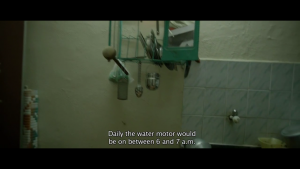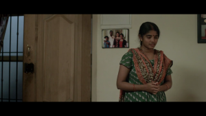 வாசல்கதவு திறந்தவுடன் அறைகளின் அளவுகள் வீட்டின் சிறிய தன்மையை காட்டுகின்றன. வாசலுக்கு இடதுபுறம் படுக்கை அறையின் கதவு இருக்கிறது. அதற்குள் அமுதா நுழைந்து இரவு உடை மாற்றிக்கொள்கிறாள். வீடடின் மூலையில் படுக்கை அறையைத் தாண்டி இடதுபுறம் கழிவறை உள்ளது. வலதுபுறம் குறகிய நடைபாதையைத் தாண்டி சிறிய சமையலறை உள்ளது. தொடர்ந்த காட்சிகளில் பாத்திரங்களின் நகர்வுகள் மூலம் வீட்டின் உட்புறத்தில் உள்ள குறுகிய வெளிகள் புலப்படுகின்றன. வீட்டுக்குள்ளிருக்கும் அறைகளிலும் காலி இடங்களிலும் பாத்திரங்கள் இயங்கும் போது அவர்களுடைய சுயம் வெளிப்படுகிறது. அமுதா படுக்கை அறைக்குள் உடைமாற்ற செல்லும் போது இளங்கோ கழிவறையை சுத்தம் செய்கிறான்.