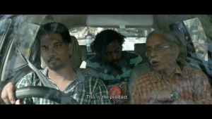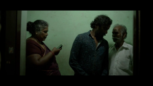 இந்த சம்பவத்தின் காட்சிப்படுத்தலை கூர்ந்து கவனிக்கவேண்டும். அது இளங்கோ அமுதா மற்றும் சித்தார்த் மோபடில் தங்களுடன் இணையாக நகரும் காமிராவுக்கு முன்னால் பயணிப்பதுடன் தொடங்குகிறது. ஒரு குறிப்பான கோணத்தில் பரந்த சுற்றுப்புறம் ஃப்ரேமில் வரும்படியாக காட்சி எடுக்கப்பட்டிருக்கிறது. இந்தப்படத்தில் நாம் பார்க்கும் குறுகலான பாதைகள் மற்றும் ஒழுங்கற்ற அறைகளின் பினபுலத்தில் இதுபோன்ற ஒரு கோணத்திலான காட்சி அபூர்வமானது. இளங்கோவின் மோபடில் பக்கவாட்டில் பார்க்கும்போது காம்பவுண்ட் சுவர்களுடன் வசதியான வீடுகள் கொண்ட இடமாக சுற்றுப்புறம் காட்சியளிக்கிறது. “டு லெட்” போர்டை பார்த்ததும் உடனே இளங்கோ மோபடை நிறுத்தி வீட்டுக்கு வெளியே வரும் சொந்தக்காரரிடம் விவரங்கள் கேட்கிறான். ஆனால் அந்த முதியவரின் கேள்வி இளங்கோ மற்றும் அமுதாவின் நம்பிக்கையை குலைக்கிறது. அவர்கள் அசைவம் என்பதால் அந்த சைவ மேல்சாதி பிராம்மணரால் நிராகரிக்கப்படுவது நிச்சயமாகிவிடுகிறது. அவருடைய உடையே அவர் மனநிலையை காட்டிவிடுகிறது.