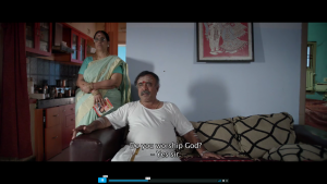 மதம் மற்றும் சாதிரீயான இத்தகைய பாரபட்சம் அடுத்த காட்சியிலும் தொடர்கிறது. அதில் வீட்டு சொந்தக்காரர் சைவவேளாளர் சமூகத்தைச் சார்ந்தவர். இங்கே ஒரு விசாலமான முன்அறையில் காட்சி அரங்கேறுகிறது. வீட்டு சொந்தக்காரர் நெற்றியில் விபூதி பூசியிருக்கிறார். பக்கத்து சுவரில் உள்ள காலண்டரில் வ.உ. சிதம்பரம் பிள்ளையின் படம் உள்ளது. வ.உ.சி. ஆங்கிலேயேருக்கு எதிராகப் போராடிய ஒரு புரட்சிக்காரர். தற்போது அவர் சொந்த சாதிக்காரர்கள் வழிபடும் பிம்பமாக இருக்கிறார். அவர்கள் தேவைக்கேத்தபடி அவரை தனதாக்கிக் கொள்கிறார்கள். இந்த காட்சிகள் வீட்டு சொந்தக்காரரை ஒரு பிராமணரல்லாத மேல்சாதிக்காரராக காட்டுகின்றன. ஆரம்பத்திலிருந்தே அவருடைய குரல் சந்தேகமானதாகவும் நட்புணர்வு அற்றதாகவும் இருக்கிறது. நீ வழிபாடு செய்வாயா என்று கேட்டு கறுப்புசட்டை அணியவேண்டாம் என்றும் சொல்கிறார். கறுப்பு சட்டையை அவர் பெரியாரின் சுயமரியாதை இயக்கத்தின் சின்னமாக பார்க்கிறார். பெரியார் மதம் மூடநம்பிக்கை சாதிமுறை மற்றும் அதன் ஆதிக்கத்துக்கு எதிராக போராடிய ஒரு சமூக சீர்திருத்தவாதி. அந்த பிற்போக்கான வீட்டு சொந்தக்காரரினால் அவமானப் படுத்தப்பட்டபின் அமைதியாகிவிட்ட இளங்கோவிடம் சினிமாத்துறையில் வேலை செய்வது குறித்த வெறுப்பை மேலும் அவர் வெளிப்படுத்தும்போது அந்த சந்திப்பை ஏற்பாடு செய்த இரக்கமுள்ள நண்பன் செல்வா (அருள் எழிலன்) தன்னுடைய நண்பன் இளங்கோவை காப்பாற்றும் முயற்சியில் இளங்கோ “கதைகள் எழுதும் எழுத்தாளர்” என்று சொல்லி நிலைமையை சாமாளிக்கப் பார்க்கிறான். பிறகு வீட்டுசொந்தக்காரர் நேரடியாக இளங்கோவின் சாதி பற்றி கேட்கும்போது அவன் சைவ வேளாளர் சாதியைச் சேர்ந்தவன் என்று பொய் சொல்கிறான். பின்னர் வீட்டு சொந்தக்காரர் அலட்சியமாக பக்கத்து தெருவில் உள்ள தனது வாடகைக்கான வீட்டை பார்க்கும்படி சொல்கிறார்.