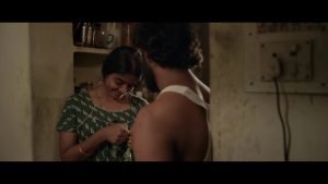 அதற்கு பின்னால் வரும் காட்சியில் இளங்கோ ஒரு கண்ணாடியால் தடுக்கப்பட்டுள்ள அறையில் ஒலிகளை பதிவு செய்து சமன் செய்துகொண்டிருக்கும் தொழில்நுட்பக் கலைஞர்களின் பின்னணியில் தனது குரலை கூட்டிக்குறைத்து தென்னிந்திய நட்சத்திர கதாநாயகனின் ஒரு சண்டைக்காட்சியை டப் செய்துகொண்டிருக்கிறான். அது அவனுக்கு உடனடியாக வீட்டுக்கு கொஞ்சம் பணத்தைக் கொண்டுவர உதவுகிறது. பிரபலமான படத்தின் டப்பிங் வேலைக்காக கிடைத்த பணத்தை அமுதாவிடம் கொடுத்து அவள் முகத்தில் ஆச்சரியம் கலந்த புன்னகையை வரவழைத்து மகிழ்வுறுகிறான். விட்டை உடனே காலி செய்யவேண்டும் என்ற அறிவிப்பு அவர்களுடைய வாழ்க்கையை சற்று குலைத்தாலும் கணநேர அரவணைப்பு அவர்களுக்கு ஆறுதல் அளிக்கிறது. எப்போதும் போல சிந்தனையில் அமிழும் அமுதா தானும் வேலைசெய்து பங்களிக்கலாம் என்பதை அவனுடன் விவாதிக்கிறாள்.
