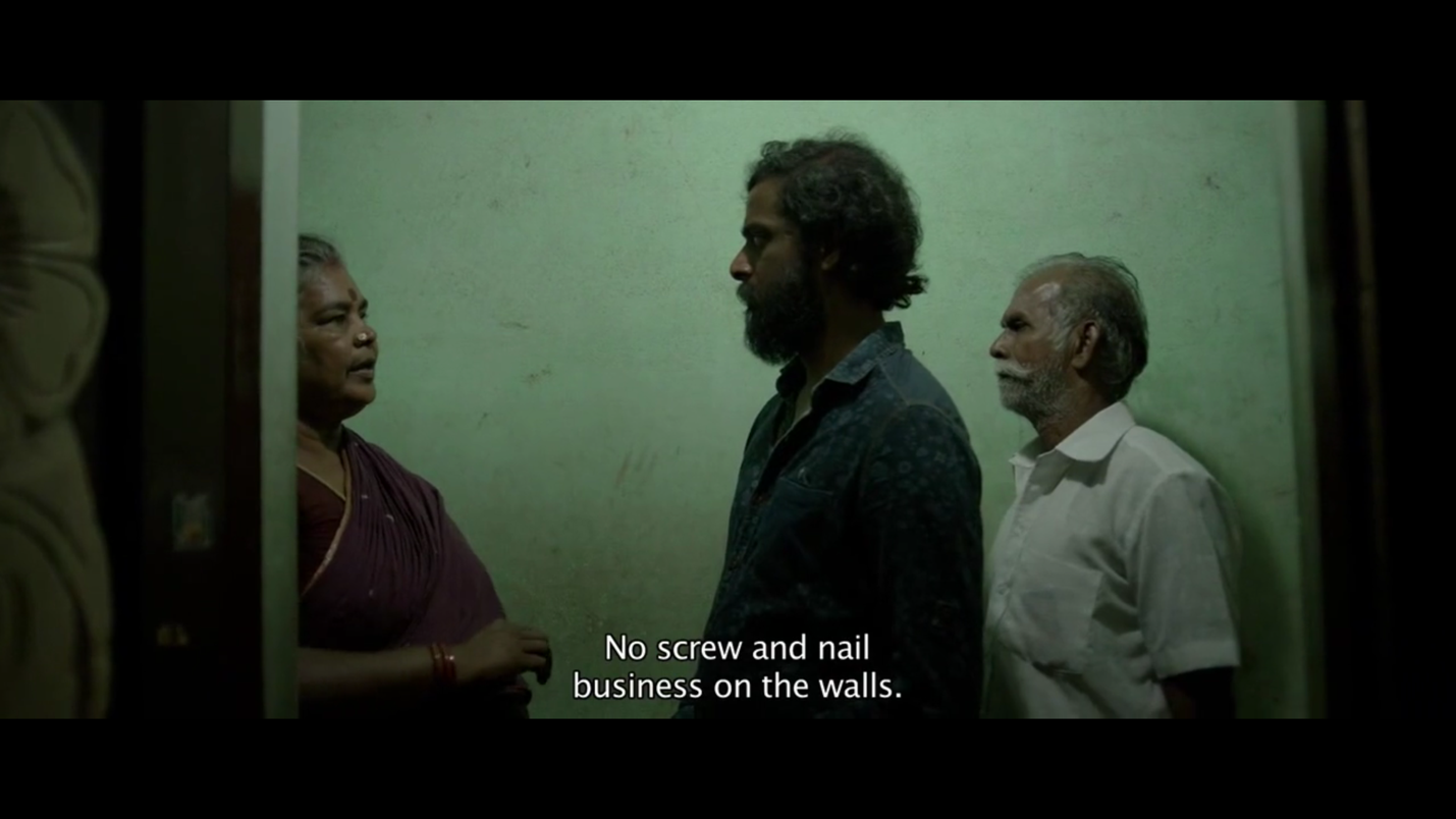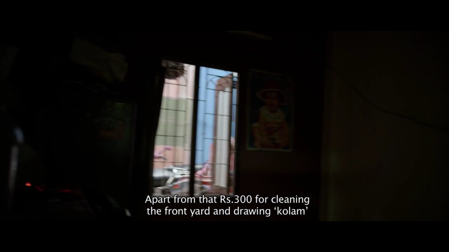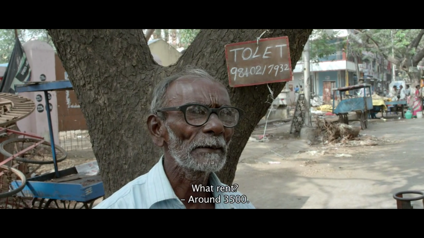 பின்னர் படலம் தொடர்கிறது. நகர்ந்துகொண்டிருக்கும் கேமரா ஒரு மாடிப்படியை அணுகுகிறது. அங்கே படிகளில் உட்கார்ந்திருக்கும் பையன்கள் தென்னாலிராமன் பற்றிய பாடங்களை படித்துக் கொண்டிருக்கிறார்கள். தென்னாலிராமன் நகைச்சுவைக்கும் அறிவுக்கூர்மைக்கும் பெயர்பெற்றவர். அவர் சமூகத்தின் சுயநலத்தையும் பேராசையையும் விமர்சித்த 16ம் நூற்றாண்டு கவிஞர். பிறகு (சட்டகத்திற்கு வெளியேயுள்ள) அருகாமையிலுள்ள ஒரு மனிதன் இந்து வேத ஆகமங்களில் பயிற்சி பெற்றவர்கள் நியமனம் என்ற செய்தியை படித்துக்கொண்டிருக்கிறான். நகர்ந்து கொண்டிருக்கும் காமிரா வலதுபுறம் திரும்பும்போது ஒரு இளம்பெண் அங்கு மாட்டப்பட்டிருக்கும் கம்பியில் துணியை காயவைத்துக் கொண்டிருக்கிறாள். வாசலில் உட்கார்ந்திருக்கும் ஒருவன் சுனிதா வில்லியம்ஸ் போஸ்டன் பந்தயத்தில் பங்குகொள்வது பற்றிய செய்தியை உரக்க வாசித்துக் கொண்டிருக்கிறான். நகரும் காமிரா இடதுபுறம் ஒரு சிறிய அறையின் நுழைவாயிலில் வந்து நிற்கும்போது நடக்கும் உரையாடலுடன் இந்த நெடுநேரம் ஓடக்கூடிய ஷாட்டுகள் நிறைந்த காட்சி முடிவடைகிறது. இறுதியில் இளங்கோ பொதுக்கழிப்பிடம் குறித்த அதிர்ச்சியையும் மறுப்பையும் தெரிவிக்கும்போது வீட்டுத்தரகர் இவ்வாறு கூறுகிறார்: “நீங்கள் கொடுக்கும் பணத்துக்கு இவ்வளவுதான் எதிர்பார்க்கமுடியும்.”