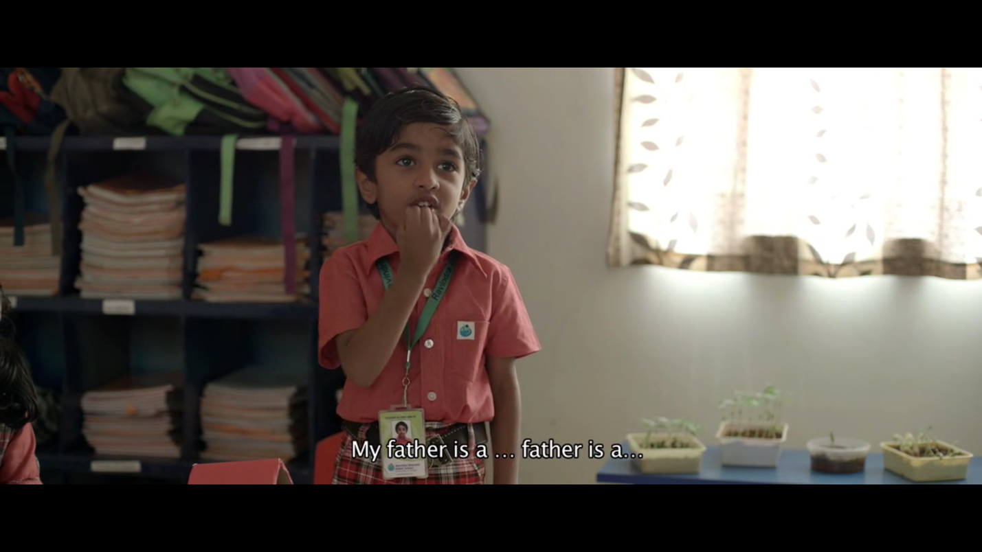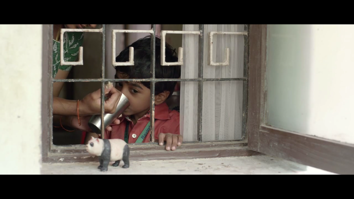 அவனுடைய பள்ளியில் உங்கள் அப்பா என்ன செய்கிறார் என்ற கேள்விக்கு அவன் பதில் அளிக்க சிரமப்படுகிறான். கடைசியாக வீட்டைவிட்டு வெளியேறும்போது சித்தார்த் சுவற்றில் பூக்கள் மலர்ந்துள்ள அவனுடைய செடி ஓவியத்தை காட்டுகிறான். தன்னுடை (மலர்ந்திருக்கும்) ஓவியத்தைப் பார்த்து அவன் மகிழ்வுடன் சிரிக்கிறான். சித்தார்த்தின் ஓவியங்கள் எப்போதும் நிகழ்காலத்தில் உள்ள குழந்தையின் உற்சாகமான சிரிக்கும் மனதை நமக்கு காட்டுகின்றன. குழந்தையின் சுயஉணர்வு அவனுடைய பெற்றோர்களின் மனநிலையிருந்து மாறுபட்டதாக இருக்கிறது. காலிசெய்யச் சொன்னவுடன் அவர்கள் எதிர்காலம் பற்றிய யோசனையிலேயே இருக்கிறார்கள். அதேபோல் கடைசியில் இளங்கோ மற்றும் அமுதாவின் சிக்கலை குறிக்கும் ஒரு படிமம் காட்டப்படுகிறது. இரண்டு மாடிக் கட்டிடங்களுக்கு நடுவே அப்பா அம்மாவுடன் நின்று கொண்டிருக்கும் சித்தார்த் பலூனை மேலே பறக்கவிடுகிறான். பலூன் இரண்டு உயரமான கட்டிடங்களுக்கு நடுவே நீலவானத்தில் காற்றில் மிதந்து செல்லும்போது ஒரு அழகான பிம்பத்தை உருவாக்குகிறது. கூடவே சித்தார்த்தின் இழப்பையும் அது சுட்டிக் காட்டுகிறது.