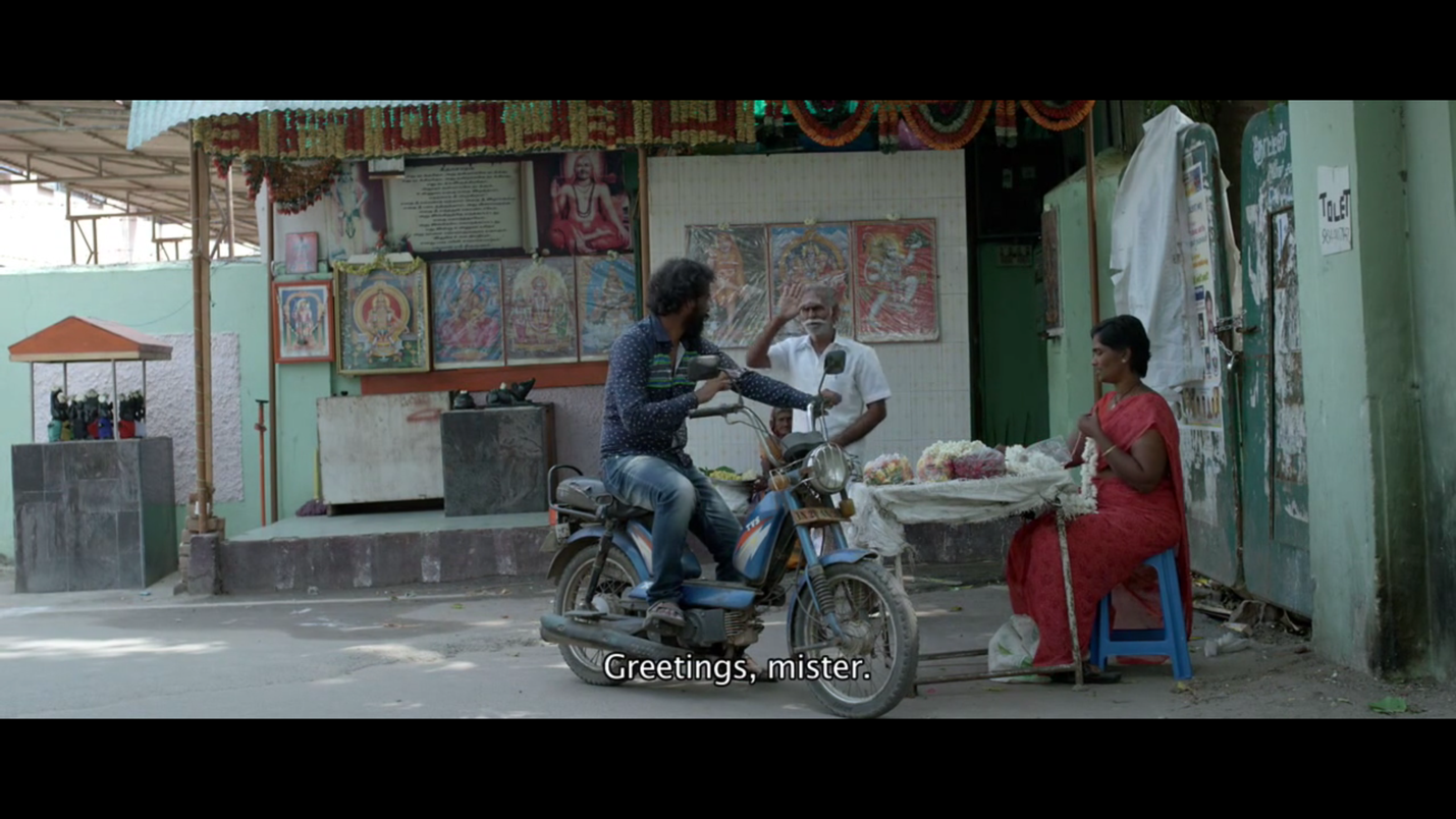 இந்த சம்பவத்தின் காட்சிப்படுத்தலை கூர்ந்து கவனிக்கவேண்டும். அது இளங்கோ அமுதா மற்றும் சித்தார்த் மோபடில் தங்களுடன் இணையாக நகரும் காமிராவுக்கு முன்னால் பயணிப்பதுடன் தொடங்குகிறது. ஒரு குறிப்பான கோணத்தில் பரந்த சுற்றுப்புறம் ஃப்ரேமில் வரும்படியாக காட்சி எடுக்கப்பட்டிருக்கிறது. இந்தப்படத்தில் நாம் பார்க்கும் குறுகலான பாதைகள் மற்றும் ஒழுங்கற்ற அறைகளின் பினபுலத்தில் இதுபோன்ற ஒரு கோணத்திலான காட்சி அபூர்வமானது. இளங்கோவின் மோபடில் பக்கவாட்டில் பார்க்கும்போது காம்பவுண்ட் சுவர்களுடன் வசதியான வீடுகள் கொண்ட இடமாக சுற்றுப்புறம் காட்சியளிக்கிறது. “டு லெட்” போர்டை பார்த்ததும் உடனே இளங்கோ மோபடை நிறுத்தி வீட்டுக்கு வெளியே வரும் சொந்தக்காரரிடம் விவரங்கள் கேட்கிறான். ஆனால் அந்த முதியவரின் கேள்வி இளங்கோ மற்றும் அமுதாவின் நம்பிக்கையை குலைக்கிறது. அவர்கள் அசைவம் என்பதால் அந்த சைவ மேல்சாதி பிராம்மணரால் நிராகரிக்கப்படுவது நிச்சயமாகிவிடுகிறது. அவருடைய உடையே அவர் மனநிலையை காட்டிவிடுகிறது.