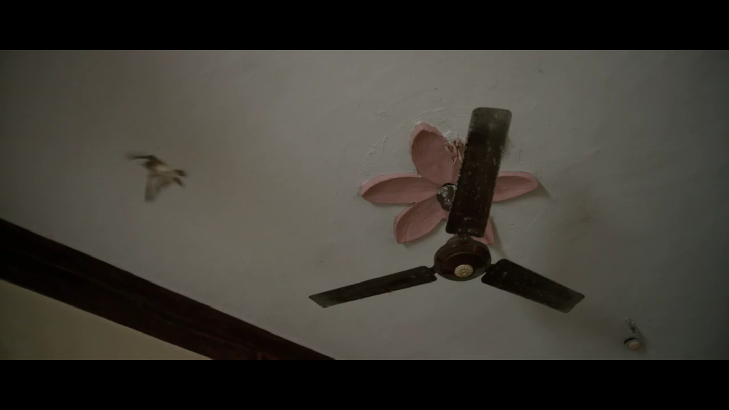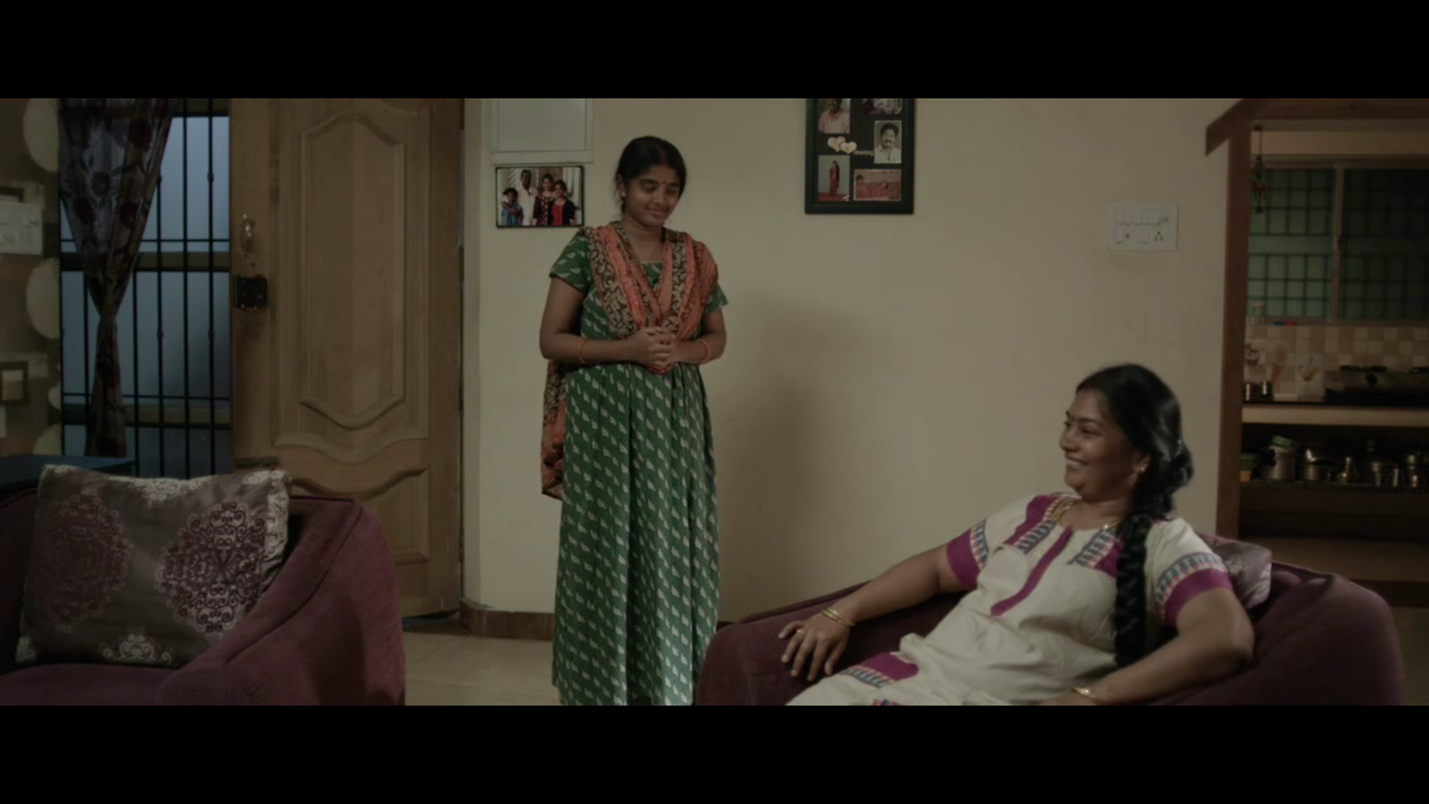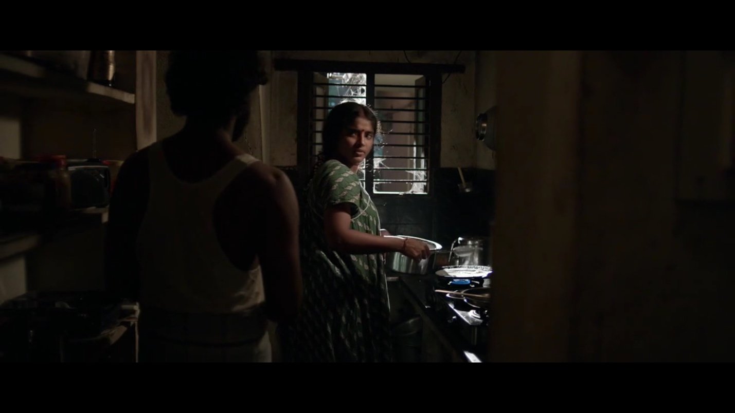 வாசல்கதவு திறந்தவுடன் அறைகளின் அளவுகள் வீட்டின் சிறிய தன்மையை காட்டுகின்றன. வாசலுக்கு இடதுபுறம் படுக்கை அறையின் கதவு இருக்கிறது. அதற்குள் அமுதா நுழைந்து இரவு உடை மாற்றிக்கொள்கிறாள். வீடடின் மூலையில் படுக்கை அறையைத் தாண்டி இடதுபுறம் கழிவறை உள்ளது. வலதுபுறம் குறகிய நடைபாதையைத் தாண்டி சிறிய சமையலறை உள்ளது. தொடர்ந்த காட்சிகளில் பாத்திரங்களின் நகர்வுகள் மூலம் வீட்டின் உட்புறத்தில் உள்ள குறுகிய வெளிகள் புலப்படுகின்றன. வீட்டுக்குள்ளிருக்கும் அறைகளிலும் காலி இடங்களிலும் பாத்திரங்கள் இயங்கும் போது அவர்களுடைய சுயம் வெளிப்படுகிறது. அமுதா படுக்கை அறைக்குள் உடைமாற்ற செல்லும் போது இளங்கோ கழிவறையை சுத்தம் செய்கிறான்.