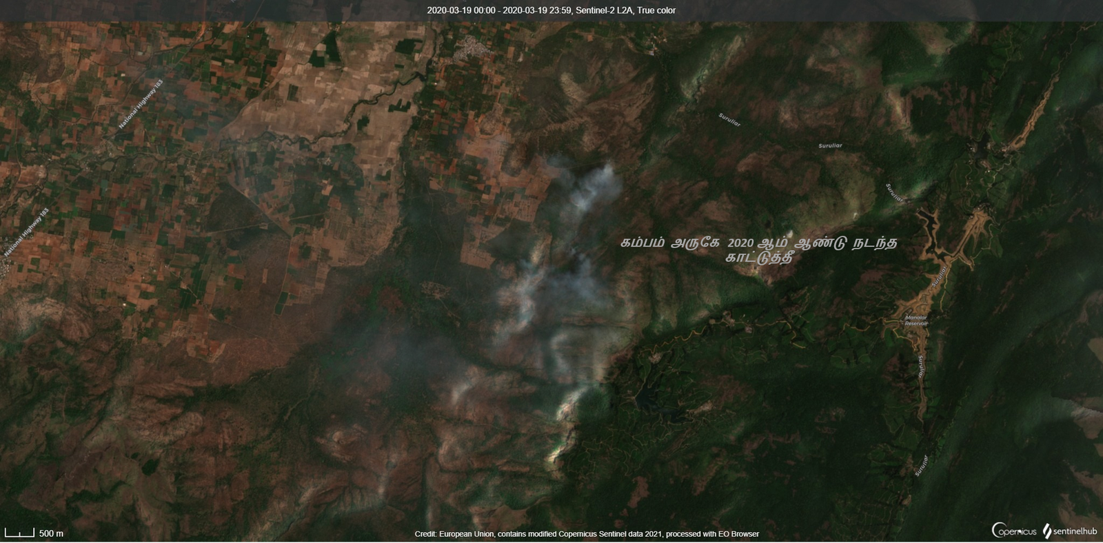 அதுபோன்று ஒவ்வொரு ஆண்டும் ஆயிரக்கணக்கான சிறிய, பெரிய தீ நிகழ்வுகள் தமிழகத்தில் நிகழ்கின்றன. சில இயற்கையானவை. செயற்கையாக மூட்டப்படும் தீயினால் காற்று மாசு நிகழ்கிறது. அவற்றில் ஒன்றினை (கம்பம் அருகே) நாம் இந்தச் செயற்கைக்கோள் புகைப்படத்தில் காணலாம். கீழே பற்றியெரியும் தீயினால் மேலே புகைமூட்டம் சூழ்ந்துள்ளதை நாம் பார்க்கலாம். இது இயற்கையானதா என்று தெளிவாக அறிய கள ஆய்வுகளையும் நிலப்பயன்பாட்டு வரைபடங்களையும் நாம் பயன்படுத்தலாம்.