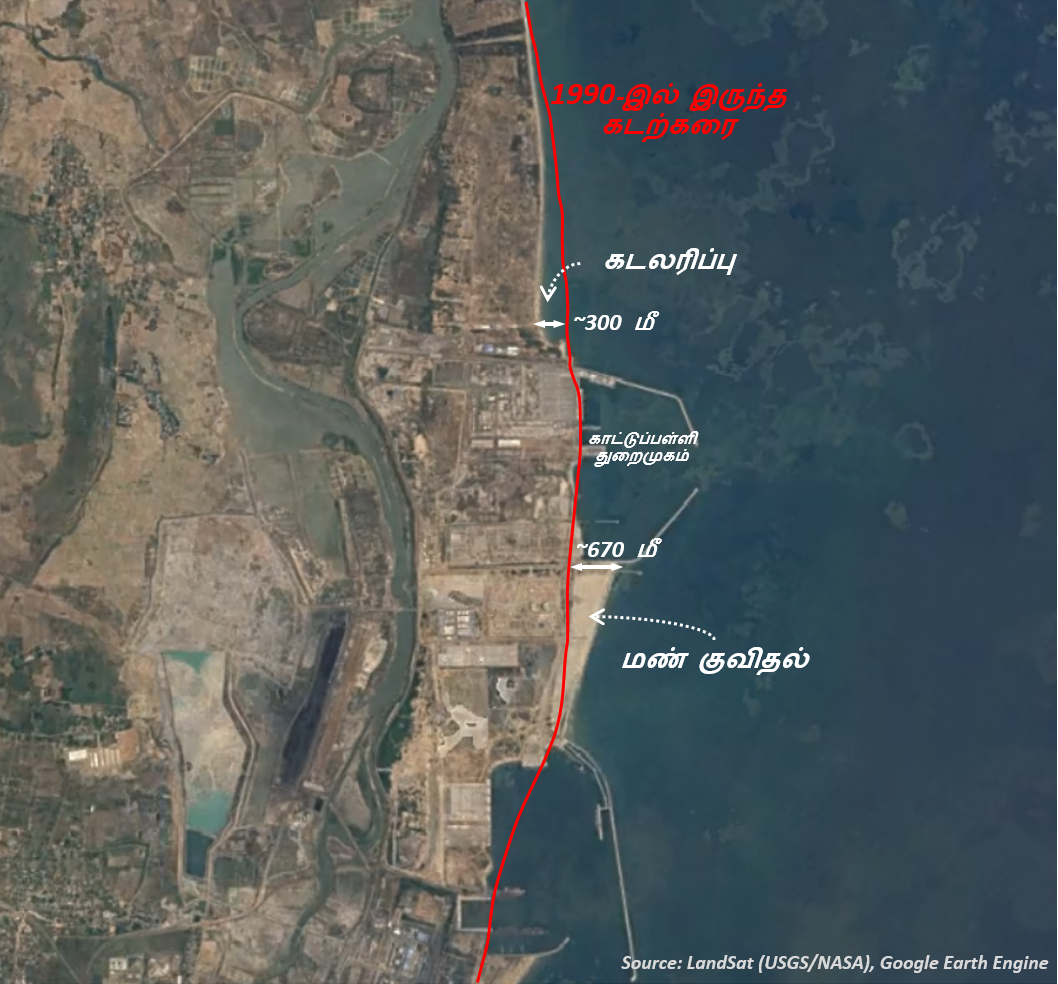 தமிழகத்தின் வளர்ச்சிக்காகக் கொண்டுவரப்பட்ட திட்டங்களில் ஒன்று காட்டுப்பள்ளி துறைமுகத் திட்டம். இந்தத் துறைமுகம் கட்டப்படுவதனால் கடல்முகத்தில் பல்வேறு மாற்றங்கள் ஏற்பட்டுள்ளன. சில இடங்களில் கடல் அரிப்பு ஏற்பட்டுள்ளது; சில இடங்களில் மண்குவிந்து கடற்கரை விரிந்துகொண்டிருக்கிறது. இதனை மேலே உள்ள வரைப்படத்தில் நீங்கள் காணலாம். 1990 முதல் 2018 வரையிலான ஆண்டுகளில் எடுக்கப்பட்ட செயற்கைக்கோள் புகைப்படங்கள் மூலம் இந்த வரைபடம் உருவாக்கப்பட்டுள்ளது. சிவப்பு கோடினால் முந்தைய கடற்கரை காட்டப்பட்டுள்ளது; அதன் பின்னணியில் அதே கடற்கரையின் தற்போதைய நிலை காட்டப்பட்டுள்ளது. சில இடங்களில் 300 மீட்டர் அளவுக்கு அரிப்பு ஏற்பட்டுள்ளது.