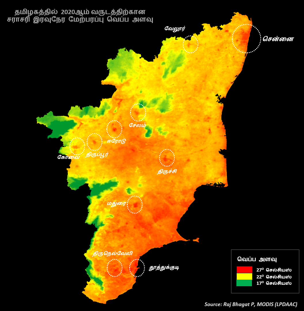 இந்த மணல் பெரும் கட்டுமானத்திற்கு மட்டுமல்லாமல் வீடுகள் கட்டவும் பயன்படுத்தப்படுகிறது. நமது கட்டுமான முறைகளில் முன்னேற்றம் இல்லாமல் இருப்பதாலும் நமது நகர வளர்ச்சித் திட்டங்கள் செம்மையாக இல்லாத காரணத்தாலும் நமது கான்கிரீட் நகரங்கள் வேகமாக வெப்பம் அடந்து வருகின்றன. இந்த வரைபடம் செயற்கைக்கோள் புகைப்படங்களைப் பயன்படுத்தி உருவாக்கப்பட்டது. அதில் இரவு நேர மேல்பரப்பு வெப்ப அளவு காட்டப்பட்டுள்ளது. இவற்றில் நமது நகரங்கள் வெப்பத்தீவுகளாக மாறுவதை நீங்கள் காணலாம்.