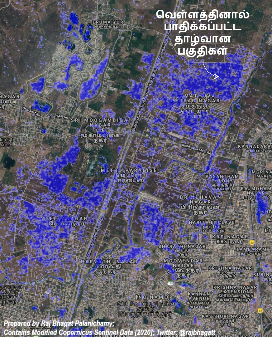 நகர வளர்ச்சித் திட்டங்கள் தெளிவான விஞ்ஞானபூர்வமான முறையில் இல்லாத காரணத்தால் மக்கள் ஆறுகளின் வெள்ளப்படுவச் சமவெளிகளிலும் வீடுகள் கட்டிவருகின்றனர். 2020இல் சென்னை முடிச்சூர் பகுதியில் வெள்ளத்தினால் பாதிக்கப்பட்ட பகுதிகளை இந்த வரைபடத்தில் காணலாம். இது ரேடார் செயற்கைக்கோள்கள் மூலம் அறியப்பட்டது.