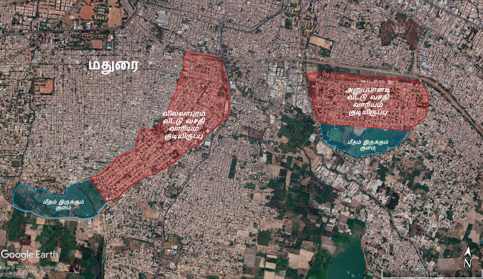 அரசாங்கக் கட்டுமானப் பணிகளும் இதற்கு விதிவிலக்கல்ல. தமிழகத்தில் பல குளங்களை ஆக்கிரமித்த பெருமை தமிழ்நாடு வீட்டுவசதி வாரியத்திற்கு உரியது. மேலே உள்ள வரைபடத்தில் மதுரையின் தென் பகுதிகளில் உள்ள இரு குளங்களை வீட்டுவசதி வாரியம் குடியிருப்புப் பகுதிகளாக (சிவப்பில் காட்டப்பட்ட பகுதி) மாற்றியுள்ளதை காணலாம். இவை 1960 முதல் செயல்பட்டுவரும் பல்வேறு செயற்கைக்கோள் புகைப்படங்கள் மூலம் உருவாக்கப்பட்டது.