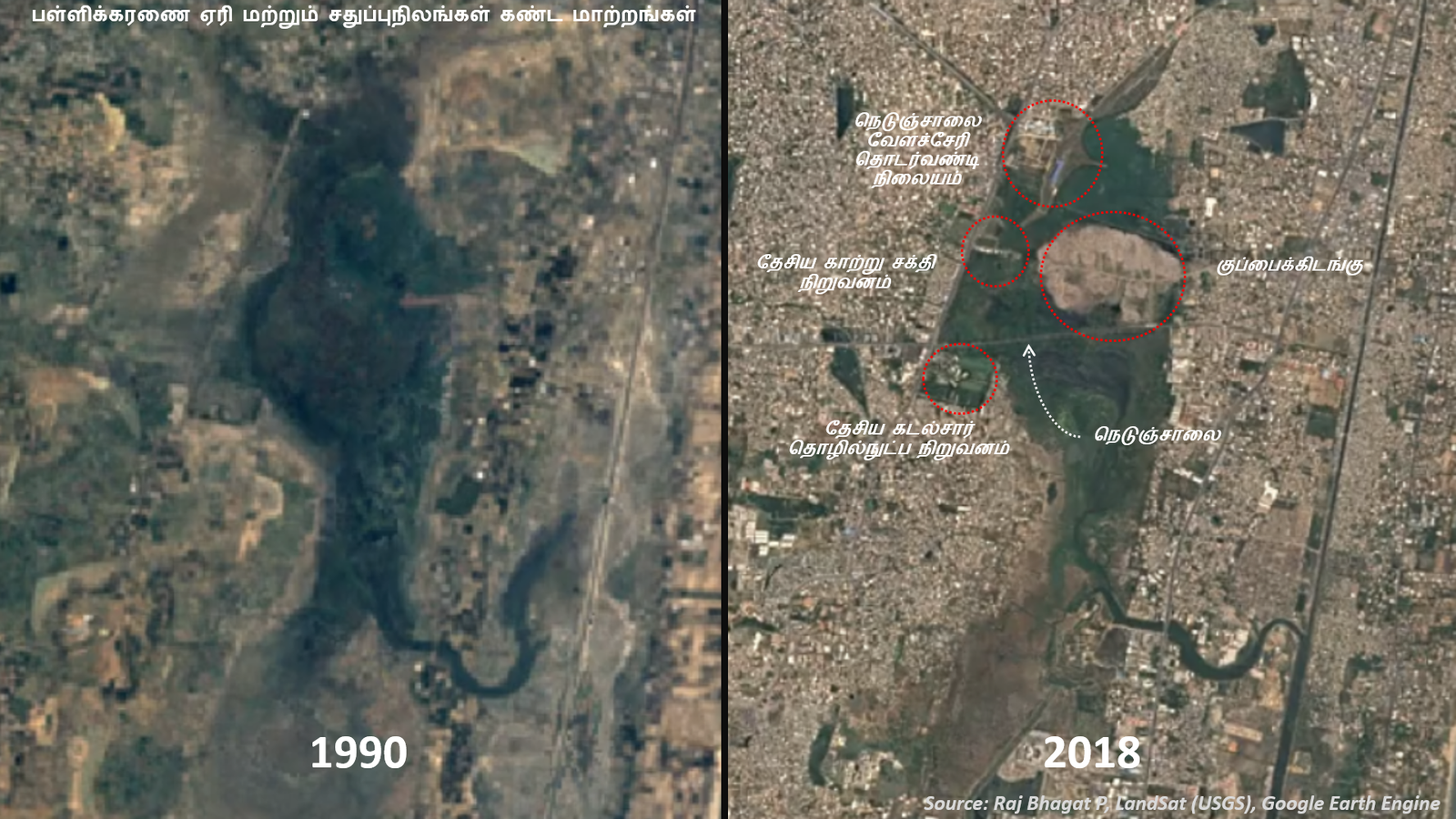 இந்தப் பிரச்சினைகள் அரசாங்கத்தின் குறிப்பிட்ட ஒரு துறைக்கு மட்டுமே உரியதல்ல. சென்னை பள்ளிக்கரணை ஏரி, சதுப்புநிலம் மற்றும் அதனைச் சார்ந்த பகுதிகள் கண்ட மாற்றத்தினை நீங்கள் இந்த வரைபடத்தில் காணலாம். இடப்பக்கம் 1990இல் இருந்த இடத்தையும் 2018இல் அதே இடத்தையும் இதில் ஒப்பிட்டுள்ளேன். தொடர்வண்டி நிலையம், தொடர்வண்டி பழுதுபார்க்குமிடம், மாநகர குப்பைக் கிடங்கு, தேசிய கடல்சார் தொழில்நுட்ப நிறுவனம், தேசிய காற்று சக்தி நிறுவனம், மற்றும் ஒரு நெடுஞ்சாலையும் இந்தப் பகுதியில் காட்டப்பட்டுள்ளது. மத்திய, மாநில, மாநகர நிர்வாகம் என மேலிருந்து கீழ்வரை அனைத்து தரப்பினருக்கும் இந்த பிழையினில் பங்குள்ளது. மீதமுள்ள நிலத்திலும் கழிவுநீர் செல்கிறது.