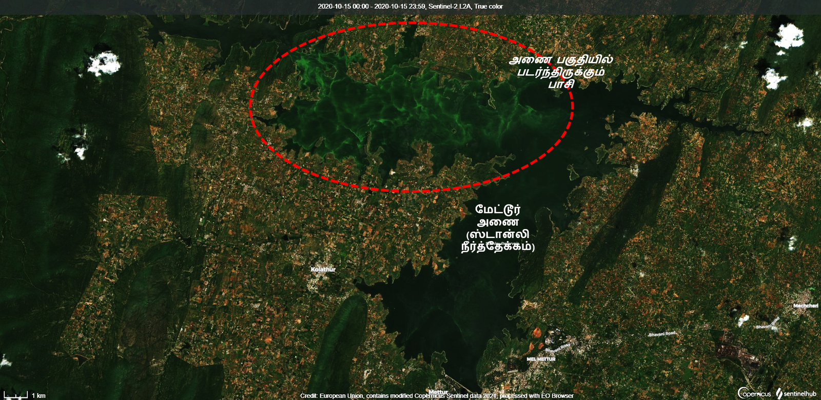 கழிவுநீர் நமது ஏரிகளில் கலப்பது போன்று விவசாய நிலங்களில் இருந்து மழைக்காலத்தில் ஓடிவரும் நீற்றில் உரங்களும் கலந்து வருகின்றன. இது விவசாயத்தில் அளவிற்கு அதிகமாக உரம் பயன்படுத்துவதால் ஏற்படுகின்றது. இவ்வாறு கழிவுநீர் மற்றும் உரம் கலந்த நீரின் பாதிப்பினை இந்தச் செயற்கைக்கோள் புகைப்படத்தில் காணலாம். மேட்டூர் அணையின் நீர் கர்நாடகத்தில் இருந்து வருகின்றது. அங்கிருந்து வரும் இக்கழிவு நீர் மற்றும் உரம் கலந்த நீரினால் பல சதுர கிலோமீட்டர்களுக்கு பாசி இருப்பதை காணலாம். இந்த பச்சை நிற நீரினை நேரடியாக உட்கொள்ளுவது சுகாதார பிரச்சினைகளை உருவாக்கியுள்ளது. இதனைச் சுத்தப்படுத்த ஆகும் செலவுகளும் மறைமுகமாக அதிகரித்துவருகின்றது.