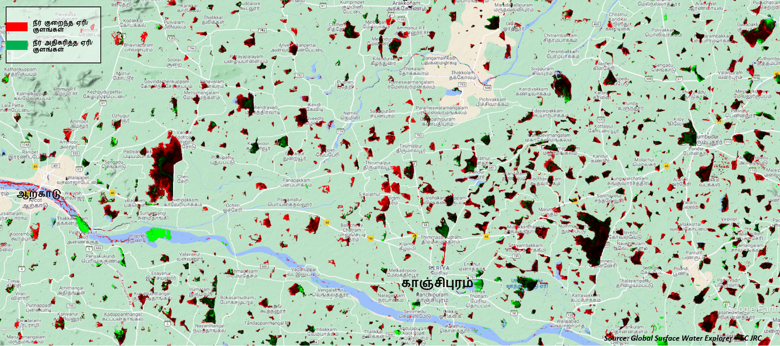தமிழகத்தில் விவசாயத்திற்கான நீர் பயன்பாடும் அதிகரித்து கொண்டே செல்கின்றது. முறையான பயிர்கள் மற்றும் அதன் காலங்கள் தேர்வு செய்யாமல் அதிக நீர் பயன்படுத்தும் பயிர்கள் நடப்படுவதால் பல இடங்களில் நிலத்தடி மற்றும் குளங்களில் உள்ள நீர் குறைந்துள்ளது. இந்த வரைபடத்தில் காஞ்சிபுரம், ஆற்காடு பகுதிகளில் உள்ள குளங்கள் கடந்த 30 ஆண்டு காலத்தில் கண்ட மாற்றங்களை காட்டுகின்றது. சிவப்பு நிறத்தில் இருக்கும் ஏரி, குளங்கள் அனைத்திலும் நீர் இருப்பு குறைந்துள்ளது. தமிழகத்தில் உள்ள பெரும்பாலான குளங்கள் நமது தேவைக்காக கட்டப்பட்டவையே இருப்பினும் அந்தத் தேவை அதிகரித்துக் கொண்டே செல்வதால் பாதிப்பு தொடர்கிறது.