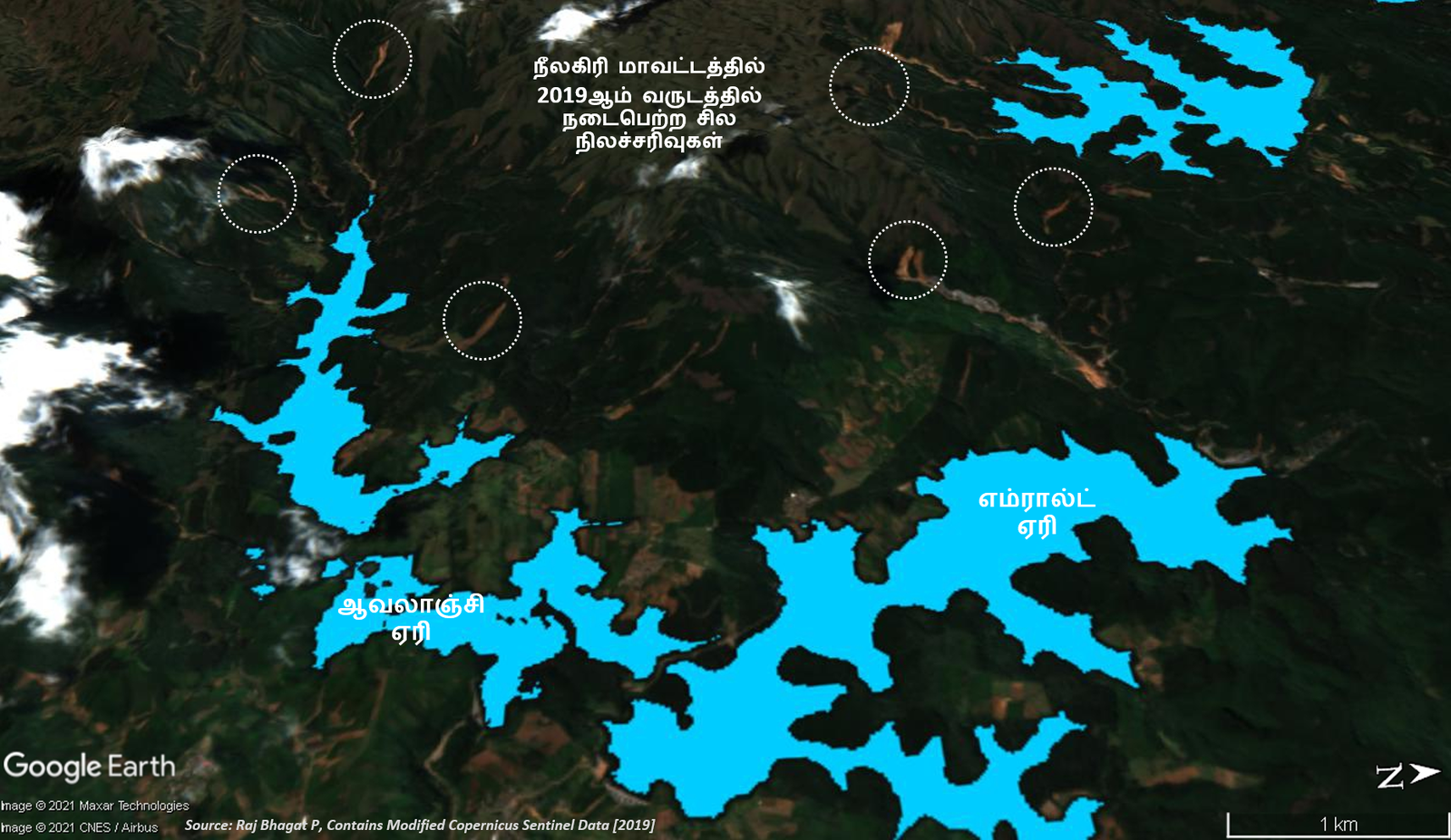 மின்சார தேவைகளுக்காக நீலகிரி போன்ற மலைப்பகுதிகளில் நாம் உருவாக்கிய நீர்நிலைகள், முறையான தொழில்நுட்பங்கள் இல்லாமல் கட்டப்பட்ட அல்லது விரிவாக்கப்பட்ட சாலைகளால் அங்கு நிலச்சரிவுகள் அதிகரித்த வண்ணம் உள்ளது. அதீத மழை மற்றும் கீழ்ப்பகுதிகளில் உள்ள இந்தக் கட்டுமானங்களால் நீலகிரி மாவட்டம் அவலாஞ்சி எரி அருகே 2020இல் ஏற்பட்ட நிலச்சரிவுகள் இந்தச் செயற்கைக்கோள் புகைப்படத்தில் காணலாம்.