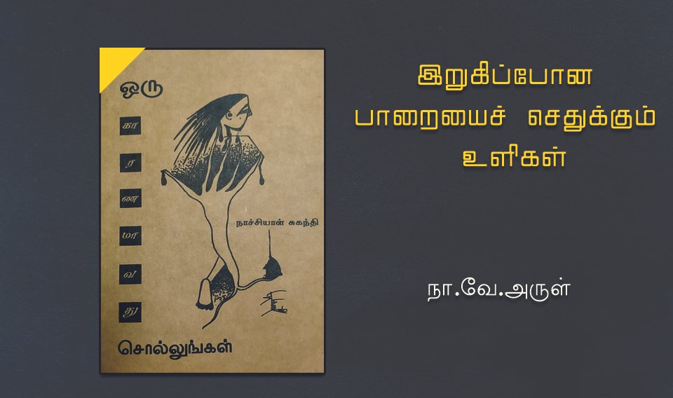 ஆனால் கவிதையின் குதிரைக்குக் கடிவாளம் இல்லை. கட்டுக்கடங்காது. சராசரிகளின் சவாரிக்கு உதவாது. மான் என்று உருவகிக்கப்பட்ட பெண் இனத்தில் பிறந்திருந்தாலும் நாச்சியாள் சுகந்தி துணிச்சலால் ஓர் ஆண். “அது என்ன ஆண்? பெண்ணுக்குத் துணிச்சல் கிடையாதா?” என்று பொடணியில் தட்டிப் பொறிகலங்கக் கேட்கிற பெண்.